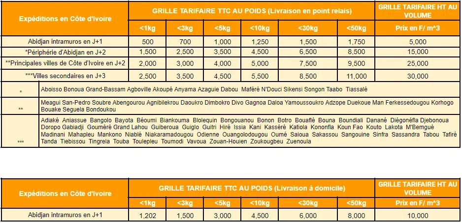 Les frais de livraison sont calculés selon la catégorie de produit, le volume du colis et la destination.
